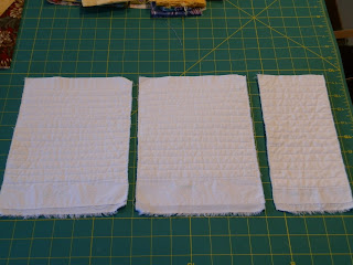 The two larger pieces are from a Fairfield 80/20 batt, one piece I prewashed, and the other I didn't. Can you see a difference?.......Me neither! The smaller piece is Warm & Natural.......and is only slightly more puckered than the other two. I drew registration marks on all of them, so I could measure the shrinkage, and the two 80/20's still shrank the same amount, even though one was prewashed AND shrunk in the dryer! What the heck! So, even though my brilliant batt test was a total failure.....it left me with the decision to just use the dang 80/20 and get it done! If it puckers and crinkles a bit, fine! It's a quilt, dang it, not a marble statue! lol